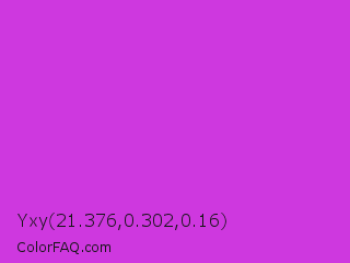 Yxy 21.376,0.302,0.16 Color is a normal magenta color and the nearest color is Steel Pink #cc33cc. Hex code #ce38df and RGB value is rgb(206,56,223). In RGB color space, this color is composed of 81% red, 22% green, 87% blue, In CMYK color space, this color is composed of 8% cyan, 75% magenta, 0% yellow , 13% black , In HSL color space, this color has a hue angle of 294° , 72% saturation and 55% lightness.