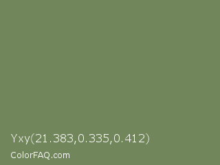 Yxy 21.383,0.335,0.412 Color is a normal green color and the nearest color is Highland #6f8e63. Hex code #72865b and RGB value is rgb(114,134,91). In RGB color space, this color is composed of 45% red, 53% green, 36% blue, In CMYK color space, this color is composed of 15% cyan, 0% magenta, 32% yellow , 47% black , In HSL color space, this color has a hue angle of 88° , 19% saturation and 44% lightness.