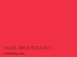 Yxy 21.396,0.573,0.317 Color is a normal red color and the nearest color is Deep Carmine Pink #ef3038. Hex code #f23043 and RGB value is rgb(242,48,67). In RGB color space, this color is composed of 95% red, 19% green, 26% blue, In CMYK color space, this color is composed of 0% cyan, 80% magenta, 72% yellow , 5% black , In HSL color space, this color has a hue angle of 354° , 88% saturation and 57% lightness.