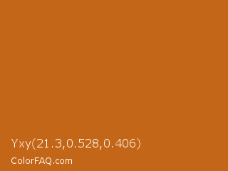 Yxy 21.3,0.528,0.406 Color is a normal orange color and the nearest color is Alloy Orange #c46210. Hex code #c46617 and RGB value is rgb(196,102,23). In RGB color space, this color is composed of 77% red, 40% green, 9% blue, In CMYK color space, this color is composed of 0% cyan, 48% magenta, 88% yellow , 23% black , In HSL color space, this color has a hue angle of 27° , 79% saturation and 43% lightness.