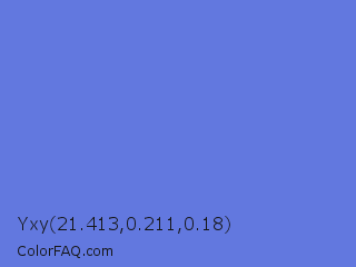 Yxy 21.413,0.211,0.18 Color is a light blue color and the nearest color is United Nations Blue #5b92e5. Hex code #6278df and RGB value is rgb(98,120,223). In RGB color space, this color is composed of 38% red, 47% green, 87% blue, In CMYK color space, this color is composed of 56% cyan, 46% magenta, 0% yellow , 13% black , In HSL color space, this color has a hue angle of 229° , 66% saturation and 63% lightness.