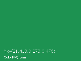 Yxy 21.413,0.273,0.476 Color is a normal green color and the nearest color is Eucalyptus #278a5b. Hex code #1d9251 and RGB value is rgb(29,146,81). In RGB color space, this color is composed of 11% red, 57% green, 32% blue, In CMYK color space, this color is composed of 80% cyan, 0% magenta, 45% yellow , 43% black , In HSL color space, this color has a hue angle of 147° , 67% saturation and 34% lightness.
