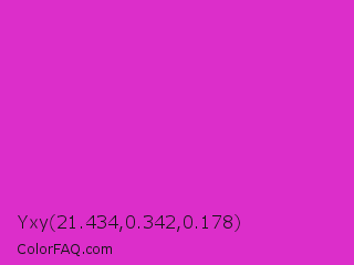 Yxy 21.434,0.342,0.178 Color is a normal magenta color and the nearest color is Steel Pink #cc33cc. Hex code #dc2eca and RGB value is rgb(220,46,202). In RGB color space, this color is composed of 86% red, 18% green, 79% blue, In CMYK color space, this color is composed of 0% cyan, 79% magenta, 8% yellow , 14% black , In HSL color space, this color has a hue angle of 306° , 71% saturation and 52% lightness.