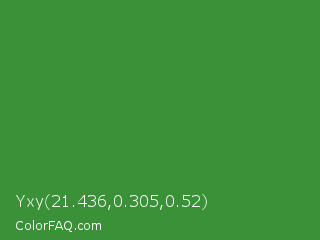 Yxy 21.436,0.305,0.52 Color is a normal green color and the nearest color is May Green #4c9141. Hex code #3a9138 and RGB value is rgb(58,145,56). In RGB color space, this color is composed of 23% red, 57% green, 22% blue, In CMYK color space, this color is composed of 60% cyan, 0% magenta, 61% yellow , 43% black , In HSL color space, this color has a hue angle of 119° , 44% saturation and 39% lightness.