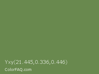 Yxy 21.445,0.336,0.446 Color is a normal green color and the nearest color is Glade Green #61845f. Hex code #69894e and RGB value is rgb(105,137,78). In RGB color space, this color is composed of 41% red, 54% green, 31% blue, In CMYK color space, this color is composed of 23% cyan, 0% magenta, 43% yellow , 46% black , In HSL color space, this color has a hue angle of 93° , 27% saturation and 42% lightness.