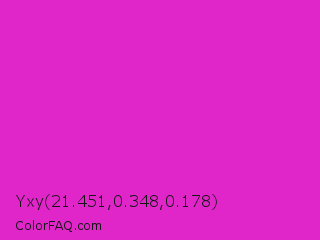 Yxy 21.451,0.348,0.178 Color is a normal magenta color and the nearest color is Steel Pink #cc33cc. Hex code #e026c9 and RGB value is rgb(224,38,201). In RGB color space, this color is composed of 88% red, 15% green, 79% blue, In CMYK color space, this color is composed of 0% cyan, 83% magenta, 10% yellow , 12% black , In HSL color space, this color has a hue angle of 307° , 75% saturation and 51% lightness.
