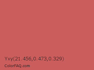 Yxy 21.456,0.473,0.329 Color is a normal red color and the nearest color is Chestnut Rose #cd5c5c. Hex code #cc5d5d and RGB value is rgb(204,93,93). In RGB color space, this color is composed of 80% red, 36% green, 36% blue, In CMYK color space, this color is composed of 0% cyan, 54% magenta, 54% yellow , 20% black , In HSL color space, this color has a hue angle of 0° , 52% saturation and 58% lightness.