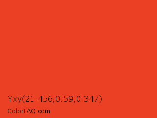 Yxy 21.456,0.59,0.347 Color is a normal red color and the nearest color is Pomegranate #f34723. Hex code #eb4024 and RGB value is rgb(235,64,36). In RGB color space, this color is composed of 92% red, 25% green, 14% blue, In CMYK color space, this color is composed of 0% cyan, 73% magenta, 85% yellow , 8% black , In HSL color space, this color has a hue angle of 8° , 83% saturation and 53% lightness.
