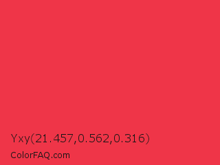 Yxy 21.457,0.562,0.316 Color is a normal red color and the nearest color is Desire #ea3c53. Hex code #ef3548 and RGB value is rgb(239,53,72). In RGB color space, this color is composed of 94% red, 21% green, 28% blue, In CMYK color space, this color is composed of 0% cyan, 78% magenta, 70% yellow , 6% black , In HSL color space, this color has a hue angle of 354° , 85% saturation and 57% lightness.