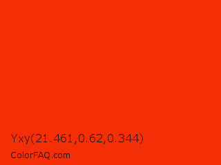 Yxy 21.461,0.62,0.344 Color is a normal red color and the nearest color is Ferrari Red #ff2800. Hex code #f52f05 and RGB value is rgb(245,47,5). In RGB color space, this color is composed of 96% red, 18% green, 2% blue, In CMYK color space, this color is composed of 0% cyan, 81% magenta, 98% yellow , 4% black , In HSL color space, this color has a hue angle of 11° , 96% saturation and 49% lightness.