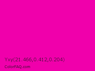 Yxy 21.466,0.412,0.204 Color is a normal magenta color and the nearest color is Hollywood Cerise #f400a1. Hex code #f000ab and RGB value is rgb(240,0,171). In RGB color space, this color is composed of 94% red, 0% green, 67% blue, In CMYK color space, this color is composed of 0% cyan, 100% magenta, 29% yellow , 6% black , In HSL color space, this color has a hue angle of 317° , 100% saturation and 47% lightness.