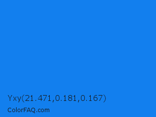 Yxy 21.471,0.181,0.167 Color is a normal blue color and the nearest color is Blue Crayola #1f75fe. Hex code #127fee and RGB value is rgb(18,127,238). In RGB color space, this color is composed of 7% red, 50% green, 93% blue, In CMYK color space, this color is composed of 92% cyan, 47% magenta, 0% yellow , 7% black , In HSL color space, this color has a hue angle of 210° , 87% saturation and 50% lightness.