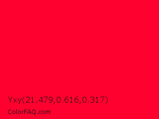 Yxy 21.479,0.616,0.317 Color is a normal red color and the nearest color is Ruddy #ff0028. Hex code #ff012e and RGB value is rgb(255,1,46). In RGB color space, this color is composed of 100% red, 0% green, 18% blue, In CMYK color space, this color is composed of 0% cyan, 100% magenta, 82% yellow , 0% black , In HSL color space, this color has a hue angle of 349° , 100% saturation and 50% lightness.