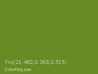 Yxy 21.482,0.363,0.515 Color is a normal green color and the nearest color is Olive Drab #6b8e23. Hex code #678b25 and RGB value is rgb(103,139,37). In RGB color space, this color is composed of 40% red, 55% green, 15% blue, In CMYK color space, this color is composed of 26% cyan, 0% magenta, 73% yellow , 45% black , In HSL color space, this color has a hue angle of 81° , 58% saturation and 35% lightness.