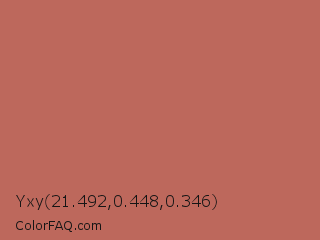 Yxy 21.492,0.448,0.346 Color is a normal red color and the nearest color is Santa Fe #b16d52. Hex code #bd685c and RGB value is rgb(189,104,92). In RGB color space, this color is composed of 74% red, 41% green, 36% blue, In CMYK color space, this color is composed of 0% cyan, 45% magenta, 51% yellow , 26% black , In HSL color space, this color has a hue angle of 7° , 42% saturation and 55% lightness.