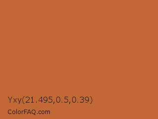Yxy 21.495,0.5,0.39 Color is a normal orange color and the nearest color is Tuscany #bd5e2e. Hex code #c16835 and RGB value is rgb(193,104,53). In RGB color space, this color is composed of 76% red, 41% green, 21% blue, In CMYK color space, this color is composed of 0% cyan, 46% magenta, 73% yellow , 24% black , In HSL color space, this color has a hue angle of 22° , 57% saturation and 48% lightness.