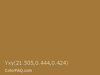 Yxy 21.505,0.444,0.424 Color is a normal orange color and the nearest color is Metallic Sunburst #9c7c38. Hex code #a37838 and RGB value is rgb(163,120,56). In RGB color space, this color is composed of 64% red, 47% green, 22% blue, In CMYK color space, this color is composed of 0% cyan, 26% magenta, 66% yellow , 36% black , In HSL color space, this color has a hue angle of 36° , 49% saturation and 43% lightness.