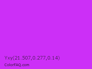 Yxy 21.507,0.277,0.14 Color is a normal purple color and the nearest color is Steel Pink #cc33cc. Hex code #cc2ff7 and RGB value is rgb(204,47,247). In RGB color space, this color is composed of 80% red, 18% green, 97% blue, In CMYK color space, this color is composed of 17% cyan, 81% magenta, 0% yellow , 3% black , In HSL color space, this color has a hue angle of 287° , 93% saturation and 58% lightness.