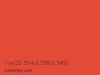 Yxy 21.514,0.558,0.345 Color is a normal red color and the nearest color is Cinnabar #e34234. Hex code #e34a38 and RGB value is rgb(227,74,56). In RGB color space, this color is composed of 89% red, 29% green, 22% blue, In CMYK color space, this color is composed of 0% cyan, 67% magenta, 75% yellow , 11% black , In HSL color space, this color has a hue angle of 6° , 75% saturation and 55% lightness.