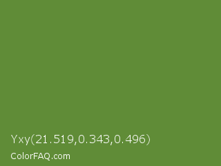 Yxy 21.519,0.343,0.496 Color is a normal green color and the nearest color is Maximum Green #5e8c31. Hex code #608c37 and RGB value is rgb(96,140,55). In RGB color space, this color is composed of 38% red, 55% green, 22% blue, In CMYK color space, this color is composed of 31% cyan, 0% magenta, 61% yellow , 45% black , In HSL color space, this color has a hue angle of 91° , 44% saturation and 38% lightness.