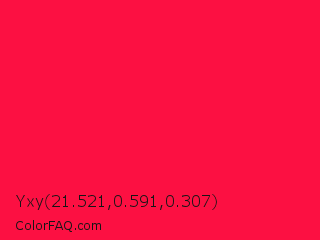 Yxy 21.521,0.591,0.307 Color is a normal red color and the nearest color is Torch Red #fd0e35. Hex code #fc1042 and RGB value is rgb(252,16,66). In RGB color space, this color is composed of 99% red, 6% green, 26% blue, In CMYK color space, this color is composed of 0% cyan, 94% magenta, 74% yellow , 1% black , In HSL color space, this color has a hue angle of 347° , 98% saturation and 53% lightness.