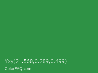 Yxy 21.568,0.289,0.499 Color is a normal green color and the nearest color is Sea Green #2e8b57. Hex code #2e9245 and RGB value is rgb(46,146,69). In RGB color space, this color is composed of 18% red, 57% green, 27% blue, In CMYK color space, this color is composed of 68% cyan, 0% magenta, 53% yellow , 43% black , In HSL color space, this color has a hue angle of 134° , 52% saturation and 38% lightness.