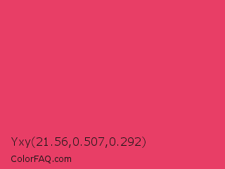 Yxy 21.56,0.507,0.292 Color is a normal red color and the nearest color is Paradise Pink #e63e62. Hex code #e83e66 and RGB value is rgb(232,62,102). In RGB color space, this color is composed of 91% red, 24% green, 40% blue, In CMYK color space, this color is composed of 0% cyan, 73% magenta, 56% yellow , 9% black , In HSL color space, this color has a hue angle of 346° , 79% saturation and 58% lightness.