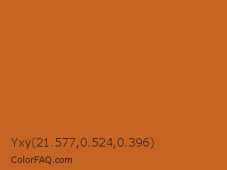 Yxy 21.577,0.524,0.396 Color is a normal orange color and the nearest color is Piper #c96323. Hex code #c76524 and RGB value is rgb(199,101,36). In RGB color space, this color is composed of 78% red, 40% green, 14% blue, In CMYK color space, this color is composed of 0% cyan, 49% magenta, 82% yellow , 22% black , In HSL color space, this color has a hue angle of 24° , 69% saturation and 46% lightness.
