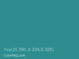 Yxy 21.591,0.234,0.325 Color is a normal cyan color and the nearest color is Lochinvar #2c8c84. Hex code #2d8d8f and RGB value is rgb(45,141,143). In RGB color space, this color is composed of 18% red, 55% green, 56% blue, In CMYK color space, this color is composed of 69% cyan, 1% magenta, 0% yellow , 44% black , In HSL color space, this color has a hue angle of 181° , 52% saturation and 37% lightness.