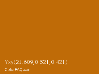 Yxy 21.609,0.521,0.421 Color is a normal orange color and the nearest color is Indochine #c26b03. Hex code #bf6b07 and RGB value is rgb(191,107,7). In RGB color space, this color is composed of 75% red, 42% green, 3% blue, In CMYK color space, this color is composed of 0% cyan, 44% magenta, 96% yellow , 25% black , In HSL color space, this color has a hue angle of 33° , 93% saturation and 39% lightness.