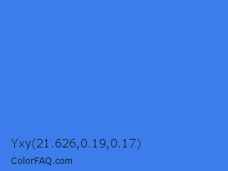 Yxy 21.626,0.19,0.17 Color is a normal blue color and the nearest color is Bleu De France #318ce7. Hex code #3c7deb and RGB value is rgb(60,125,235). In RGB color space, this color is composed of 24% red, 49% green, 92% blue, In CMYK color space, this color is composed of 74% cyan, 47% magenta, 0% yellow , 8% black , In HSL color space, this color has a hue angle of 218° , 81% saturation and 58% lightness.