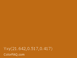 Yxy 21.642,0.517,0.417 Color is a normal orange color and the nearest color is Alloy Orange #c46210. Hex code #bf6b14 and RGB value is rgb(191,107,20). In RGB color space, this color is composed of 75% red, 42% green, 8% blue, In CMYK color space, this color is composed of 0% cyan, 44% magenta, 90% yellow , 25% black , In HSL color space, this color has a hue angle of 31° , 81% saturation and 41% lightness.