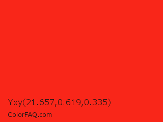 Yxy 21.657,0.619,0.335 Color is a normal red color and the nearest color is Red RYB #fe2712. Hex code #f92619 and RGB value is rgb(249,38,25). In RGB color space, this color is composed of 98% red, 15% green, 10% blue, In CMYK color space, this color is composed of 0% cyan, 85% magenta, 90% yellow , 2% black , In HSL color space, this color has a hue angle of 3° , 95% saturation and 54% lightness.