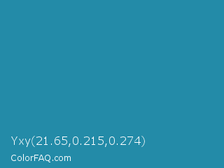Yxy 21.65,0.215,0.274 Color is a normal cyan color and the nearest color is Eastern Blue #1e9ab0. Hex code #238ba8 and RGB value is rgb(35,139,168). In RGB color space, this color is composed of 14% red, 55% green, 66% blue, In CMYK color space, this color is composed of 79% cyan, 17% magenta, 0% yellow , 34% black , In HSL color space, this color has a hue angle of 193° , 66% saturation and 40% lightness.