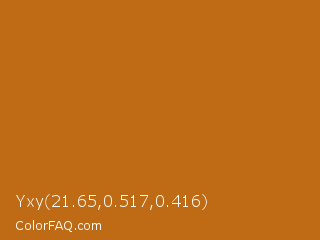 Yxy 21.65,0.517,0.416 Color is a normal orange color and the nearest color is Bourbon #ba6f1e. Hex code #bf6b15 and RGB value is rgb(191,107,21). In RGB color space, this color is composed of 75% red, 42% green, 8% blue, In CMYK color space, this color is composed of 0% cyan, 44% magenta, 89% yellow , 25% black , In HSL color space, this color has a hue angle of 30° , 80% saturation and 42% lightness.