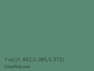 Yxy 21.662,0.285,0.373 Color is a normal green color and the nearest color is Wintergreen Dream #56887d. Hex code #5b8a74 and RGB value is rgb(91,138,116). In RGB color space, this color is composed of 36% red, 54% green, 45% blue, In CMYK color space, this color is composed of 34% cyan, 0% magenta, 16% yellow , 46% black , In HSL color space, this color has a hue angle of 152° , 21% saturation and 45% lightness.