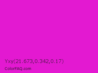 Yxy 21.673,0.342,0.17 Color is a normal magenta color and the nearest color is Hot Magenta #ff1dce. Hex code #e319d1 and RGB value is rgb(227,25,209). In RGB color space, this color is composed of 89% red, 10% green, 82% blue, In CMYK color space, this color is composed of 0% cyan, 89% magenta, 8% yellow , 11% black , In HSL color space, this color has a hue angle of 305° , 80% saturation and 49% lightness.
