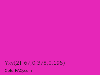 Yxy 21.67,0.378,0.195 Color is a normal magenta color and the nearest color is Frostbite #e936a7. Hex code #e626b8 and RGB value is rgb(230,38,184). In RGB color space, this color is composed of 90% red, 15% green, 72% blue, In CMYK color space, this color is composed of 0% cyan, 83% magenta, 20% yellow , 10% black , In HSL color space, this color has a hue angle of 314° , 79% saturation and 53% lightness.