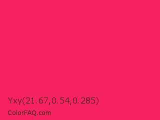 Yxy 21.67,0.54,0.285 Color is a normal rose color and the nearest color is Awesome #ff2052. Hex code #f72061 and RGB value is rgb(247,32,97). In RGB color space, this color is composed of 97% red, 13% green, 38% blue, In CMYK color space, this color is composed of 0% cyan, 87% magenta, 61% yellow , 3% black , In HSL color space, this color has a hue angle of 342° , 93% saturation and 55% lightness.