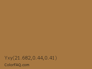 Yxy 21.682,0.44,0.41 Color is a normal orange color and the nearest color is Metallic Sunburst #9c7c38. Hex code #a67741 and RGB value is rgb(166,119,65). In RGB color space, this color is composed of 65% red, 47% green, 25% blue, In CMYK color space, this color is composed of 0% cyan, 28% magenta, 61% yellow , 35% black , In HSL color space, this color has a hue angle of 32° , 44% saturation and 45% lightness.