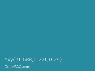 Yxy 21.688,0.221,0.29 Color is a normal cyan color and the nearest color is Jelly Bean #297b9a. Hex code #278ca0 and RGB value is rgb(39,140,160). In RGB color space, this color is composed of 15% red, 55% green, 63% blue, In CMYK color space, this color is composed of 76% cyan, 13% magenta, 0% yellow , 37% black , In HSL color space, this color has a hue angle of 190° , 61% saturation and 39% lightness.