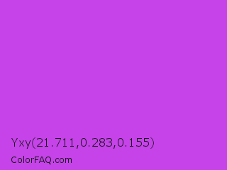 Yxy 21.711,0.283,0.155 Color is a normal purple color and the nearest color is Medium Orchid #ba55d3. Hex code #c543e8 and RGB value is rgb(197,67,232). In RGB color space, this color is composed of 77% red, 26% green, 91% blue, In CMYK color space, this color is composed of 15% cyan, 71% magenta, 0% yellow , 9% black , In HSL color space, this color has a hue angle of 287° , 78% saturation and 59% lightness.