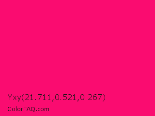 Yxy 21.711,0.521,0.267 Color is a normal rose color and the nearest color is Vivid Raspberry #ff006c. Hex code #fa0c70 and RGB value is rgb(250,12,112). In RGB color space, this color is composed of 98% red, 5% green, 44% blue, In CMYK color space, this color is composed of 0% cyan, 95% magenta, 55% yellow , 2% black , In HSL color space, this color has a hue angle of 335° , 96% saturation and 51% lightness.