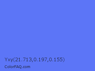 Yxy 21.713,0.197,0.155 Color is a light blue color and the nearest color is Very Light Blue #6666ff. Hex code #5c75f7 and RGB value is rgb(92,117,247). In RGB color space, this color is composed of 36% red, 46% green, 97% blue, In CMYK color space, this color is composed of 63% cyan, 53% magenta, 0% yellow , 3% black , In HSL color space, this color has a hue angle of 230° , 91% saturation and 66% lightness.