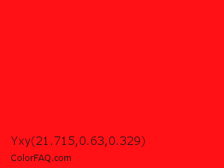 Yxy 21.715,0.63,0.329 Color is a normal red color and the nearest color is Vivid Red #f70d1a. Hex code #ff1115 and RGB value is rgb(255,17,21). In RGB color space, this color is composed of 100% red, 7% green, 8% blue, In CMYK color space, this color is composed of 0% cyan, 93% magenta, 92% yellow , 0% black , In HSL color space, this color has a hue angle of 359° , 100% saturation and 53% lightness.