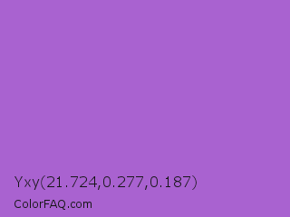 Yxy 21.724,0.277,0.187 Color is a normal purple color and the nearest color is Rich Lavender #a76bcf. Hex code #a962d0 and RGB value is rgb(169,98,208). In RGB color space, this color is composed of 66% red, 38% green, 82% blue, In CMYK color space, this color is composed of 19% cyan, 53% magenta, 0% yellow , 18% black , In HSL color space, this color has a hue angle of 279° , 54% saturation and 60% lightness.