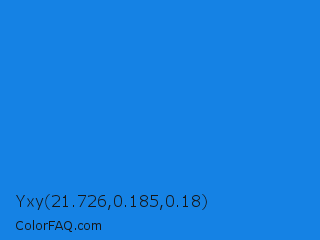 Yxy 21.726,0.185,0.18 Color is a normal blue color and the nearest color is Bright Navy Blue #1974d2. Hex code #1582e4 and RGB value is rgb(21,130,228). In RGB color space, this color is composed of 8% red, 51% green, 89% blue, In CMYK color space, this color is composed of 91% cyan, 43% magenta, 0% yellow , 11% black , In HSL color space, this color has a hue angle of 208° , 83% saturation and 49% lightness.