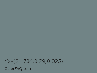 Yxy 21.734,0.29,0.325 Color is a normal cyan color and the nearest color is Blue Smoke #748881. Hex code #718486 and RGB value is rgb(113,132,134). In RGB color space, this color is composed of 44% red, 52% green, 53% blue, In CMYK color space, this color is composed of 16% cyan, 1% magenta, 0% yellow , 47% black , In HSL color space, this color has a hue angle of 186° , 9% saturation and 48% lightness.