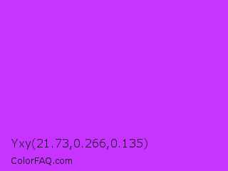 Yxy 21.73,0.266,0.135 Color is a normal purple color and the nearest color is Veronica #a020f0. Hex code #c733ff and RGB value is rgb(199,51,255). In RGB color space, this color is composed of 78% red, 20% green, 100% blue, In CMYK color space, this color is composed of 22% cyan, 80% magenta, 0% yellow , 0% black , In HSL color space, this color has a hue angle of 284° , 100% saturation and 60% lightness.