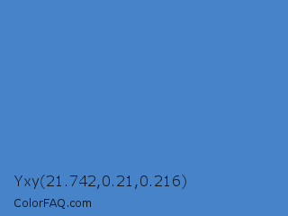 Yxy 21.742,0.21,0.216 Color is a normal blue color and the nearest color is Cyan Blue Azure #4682bf. Hex code #4783c8 and RGB value is rgb(71,131,200). In RGB color space, this color is composed of 28% red, 51% green, 78% blue, In CMYK color space, this color is composed of 65% cyan, 35% magenta, 0% yellow , 22% black , In HSL color space, this color has a hue angle of 212° , 54% saturation and 53% lightness.